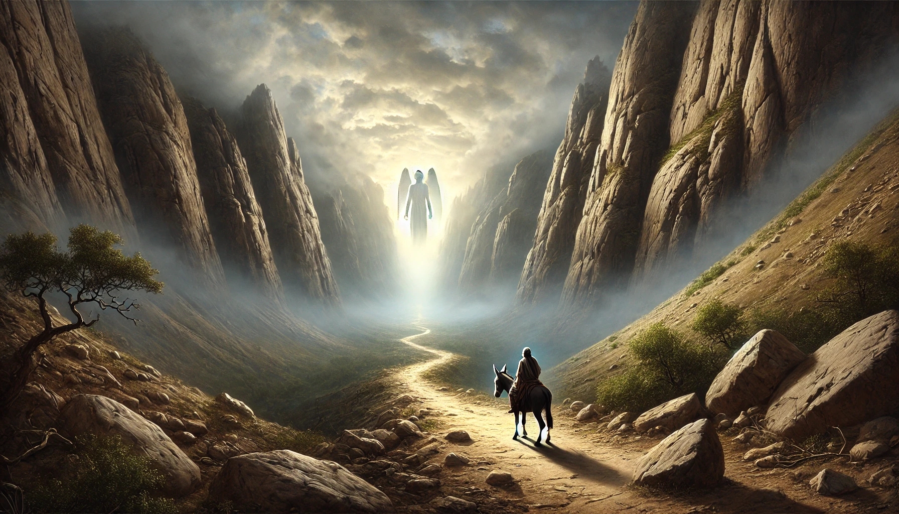 Bileam will trotz göttlichem Verbot losziehen. Gott blockiert den Weg durch einen Engel, den nur die Eselin sieht. Der Prophet, geistlich blind, schlägt das Tier, bis Gott ihm die Augen öffnet.